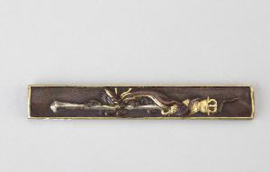 Impugnatura (kozuka) di coltellino (kogatana) in lega metallica shakudo. Superficie lavorata a bulino con puntinatura regolare (nanako), decorata con drago (ryu) che si avvolge sulla spada rituale (ken) e la morde in agemina d'oro e altri metalli ad alto rilievo (iroetakazogan).