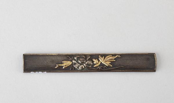 Impugnatura (kozuka) di coltellino (kogatana) in lega metallica shakudo. Superficie lavorata a bulino con puntinatura regolare (nanako), decorata con rametto fiorito in agemina d'oro ad alto rilievo (takazogan) e incisioni (takanikubori).