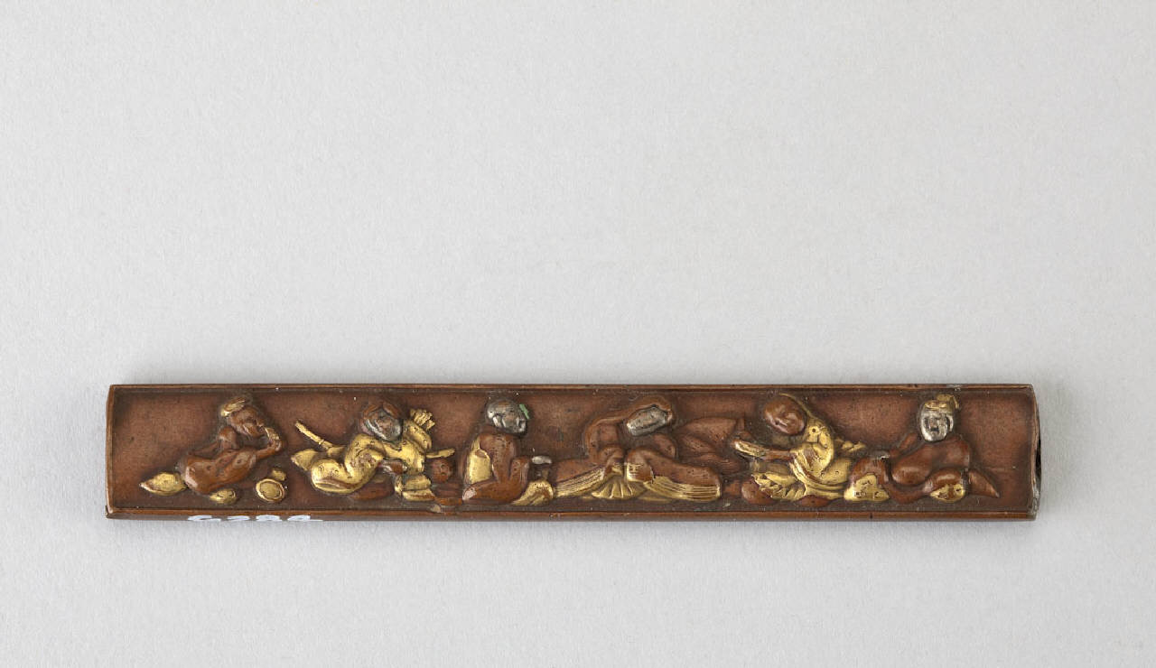 Impugnatura (kozuka) di coltellino (kogatana) in rame yamagane. Superficie liscia (migakiji), decorata in alto rilievo (takabori) con i Sei Saggi della Poesia (Rokkasen) seduti uno vicino all'altro, in agemina d'oro e d'argento ad alto rilievo (iroe takazogan) e incisioni (takanikubori).