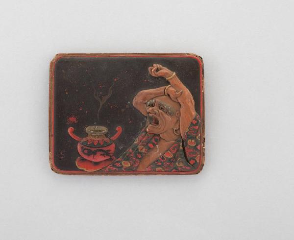 Tavoletta votiva (ema) in legno laccato, fondo nero e pittura policroma. Sulla destra si vede il busto di un rakan che si tiene il braccio sinistro con la mano destra; sul lato sinitro un vaso rituale.