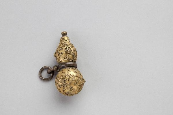 Netsuke in bronzo dorato a forma di zucca (hyotan) con anello posto nella strozzatura. La superficie esterna è ornata da motivi di tralci floreali a rilievo.