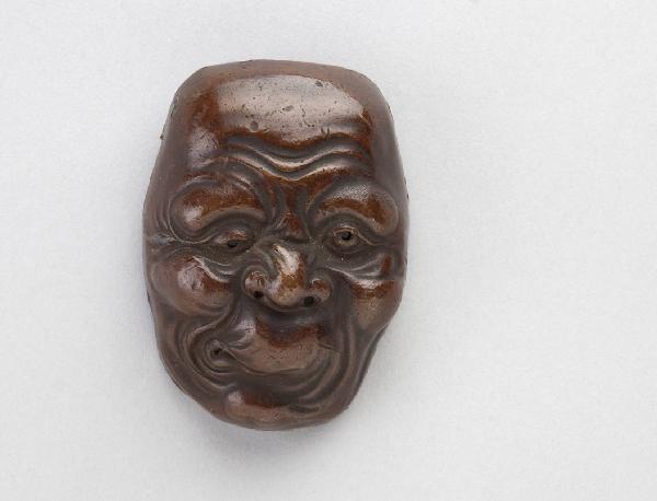 Netsuke in bronzo yamagane raffigurante maschera del personaggio teatrale Hyottoko, riconoscibile per i tratti caricaturali del volto.