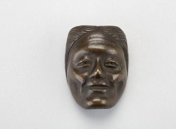 Netsuke in bronzo raffigurante maschera di personaggio femminile anziano.