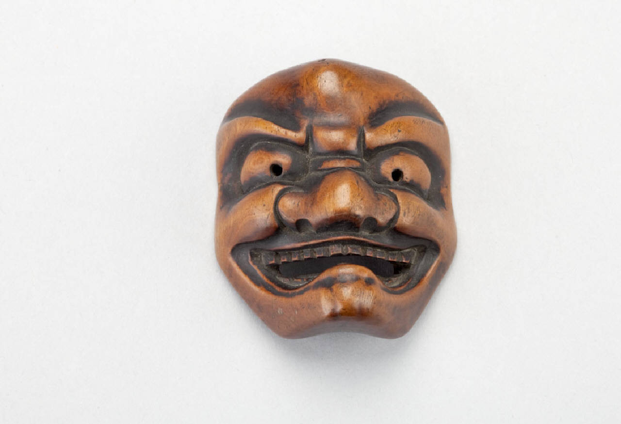 Netsuke in legno intagliato, raffigurante maschera di personaggio teatrale di oni, riconoscibile per i tratti demonieschi del volto.