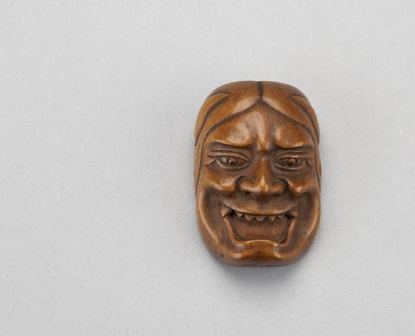 Netsuke in legno intagliato, raffigurante maschera di personaggio teatrale dai tratti femminili e demonieschi.