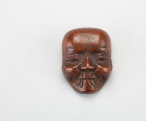 Netsuke in legno intagliato, raffigurante maschera di personaggio teatrale dai tratti femminili e di vecchiaia.