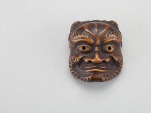 Netsuke in legno intagliato, raffigurante sul davanti maschera di personaggio teatrale di demone (oni), e sul retro piccola maschera di Okame.