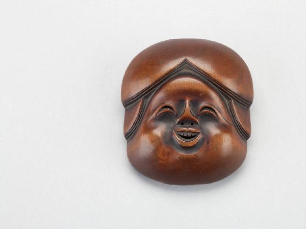 Netsuke in legno intagliato, raffigurante maschera del personaggio teatrale di Okame, riconoscibile per il viso paffuto.