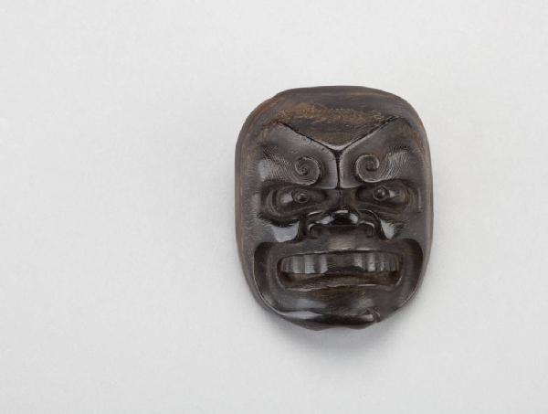 Netsuke in legno intagliato, raffigurante maschera di personaggio teatrale di oni, riconoscibile per i tratti demonieschi del volto.