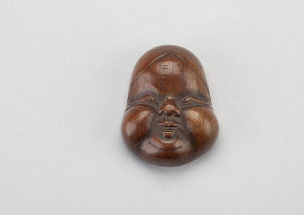 Netsuke in legno intagliato, raffigurante maschera del personaggio teatrale di Okame, riconoscibile per il viso paffuto.