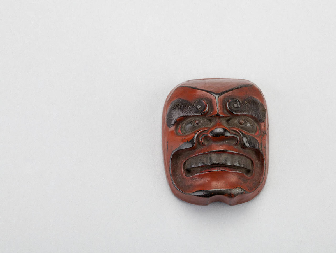 Netsuke in legno intagliato e laccato di rosso e di nero, raffigurante maschera del personaggio teatrale del demone oni.