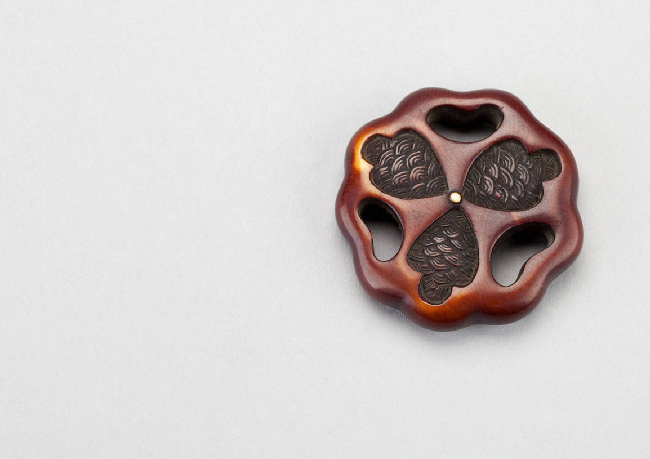 Netsuke di tipo ryusa-manju in avorio intagliato e tinto, a forma di fiore stilizzato.