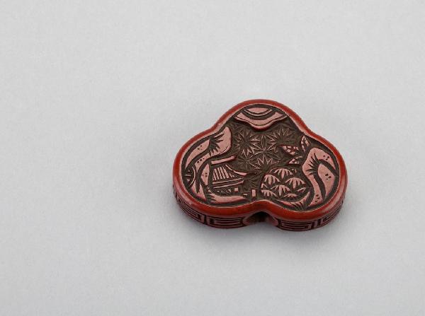Netsuke di tipo manju in legno intagliato e laccato di rosso. Di forma trilobata, mostra sui due lati maggiori composizioni vegetali con rocce.