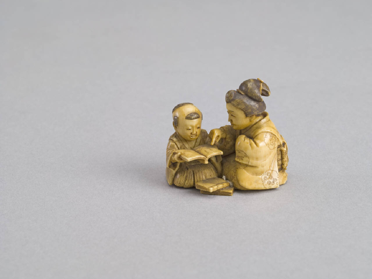 Netsuke in avorio intagliato, con dettagli a incisione e inchiostratura, raffigurante un donna seduta che insegna a leggere ad un bambino.