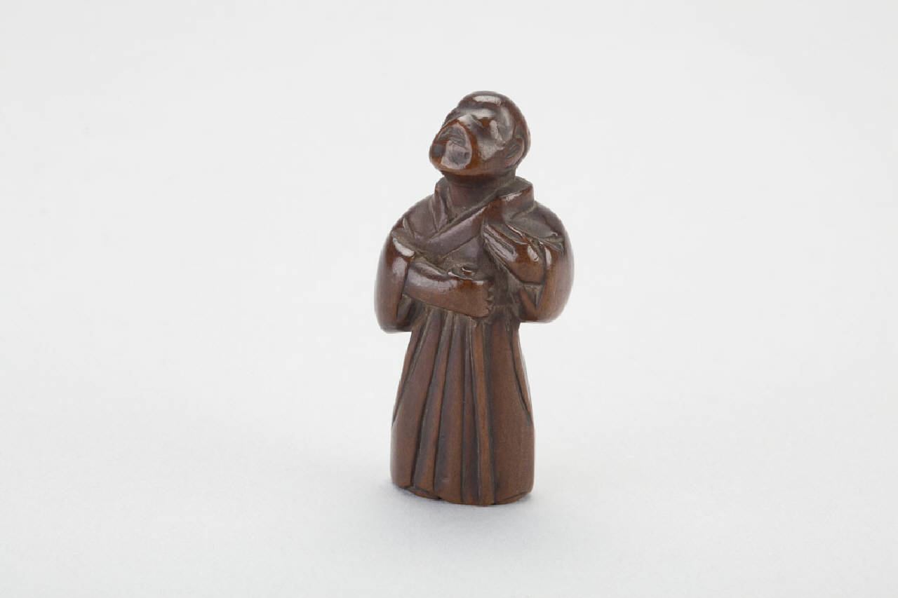 Netsuke in legno intagliato raffigurante un demone (oni) travestito da monaco buddhista.