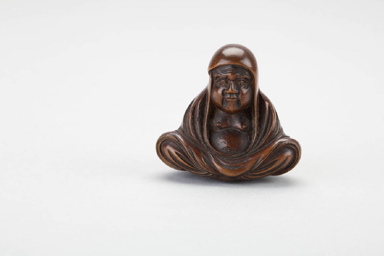Netsuke in legno intagliato raffigurante Daruma seduto con le gambe incrociate.