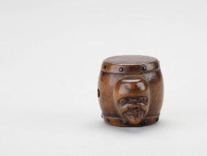 Netsuke in legno intagliato raffigurante tamburo e maschere teatrali.