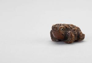 Netsuke in legno intagliato raffigurante una rana. Occhi in avorio.