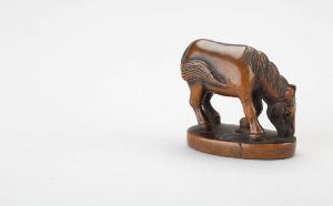 Netsuke in legno intagliato raffigurante un cavallo su base ovale.
