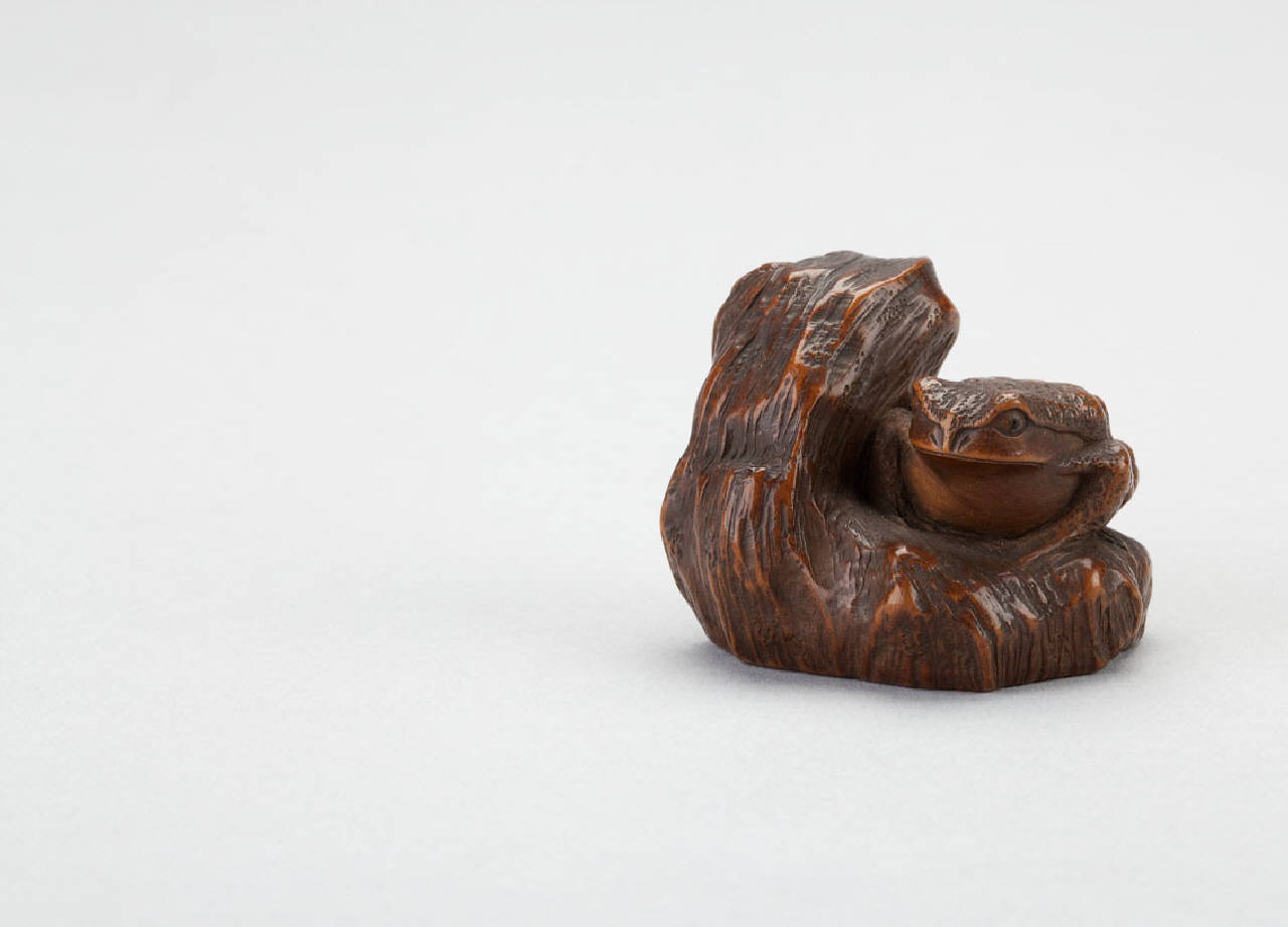 Netsuke in legno intagliato raffigurante una rana su un tronco d'albero.