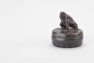 Netsuke in legno intagliato raffigurante un demone (forse Raiden, il dio del tuono) su un tamburo.