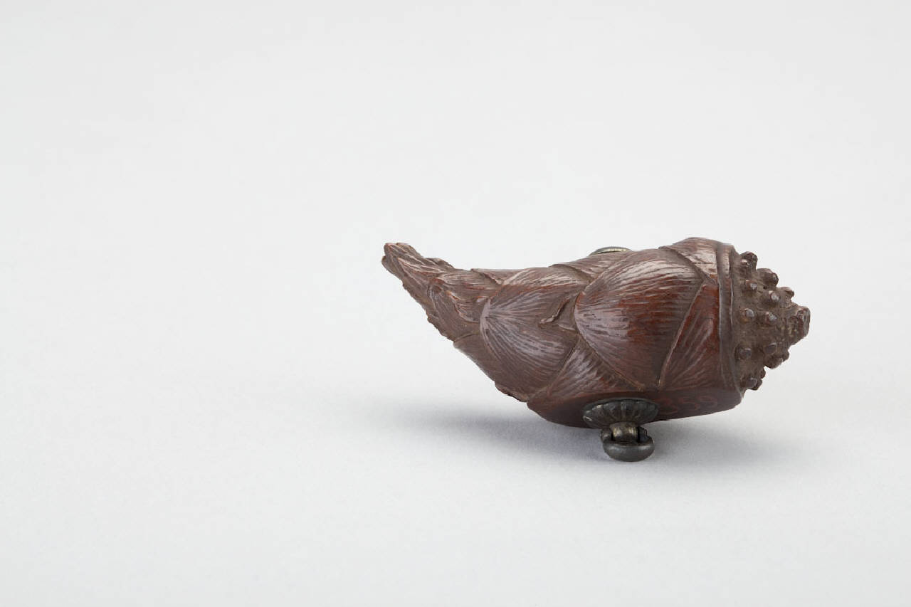 Netsuke in legno intagliato raffigurante un germoglio di bambù (take). Anello in argento.