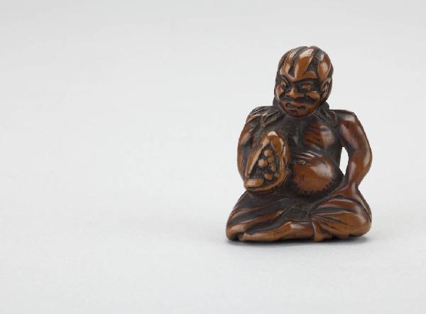 Netsuke in legno intagliato raffigurante l'immortale taoista Gamma Sennin con l'inseparabile rospo a tre zampe.