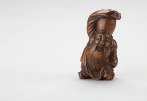Netsuke in legno intagliato e policromato raffigurante Fukurokuju.