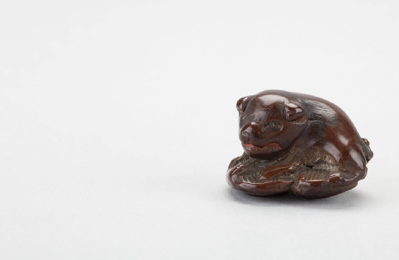 Netsuke in legno intagliato raffigurante un cucciolo di cane posato su due sandali.
