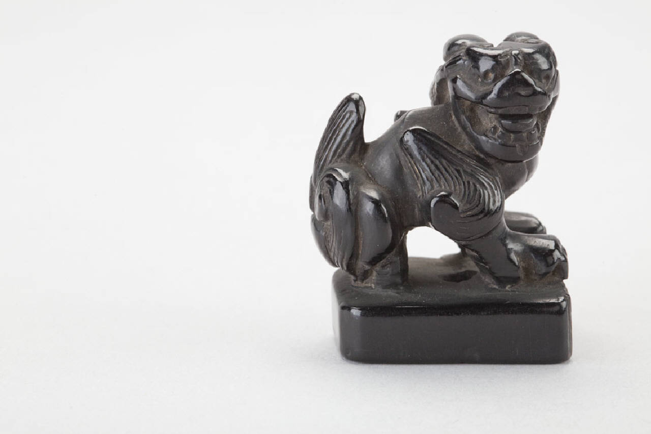 Netsuke in legno intagliato raffigurante un 'leone cinese' (karashishi) su base a sezione quadrata.
