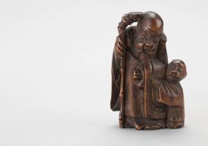 Netsuke in legno intagliato raffigurante Fukurokuju accompagnato da un bambino.