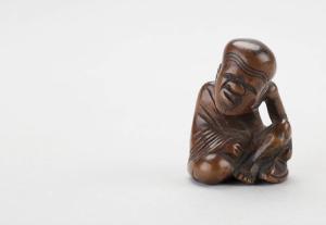 Netsuke in legno intagliato raffigurante un cieco che si applica la moxa.
