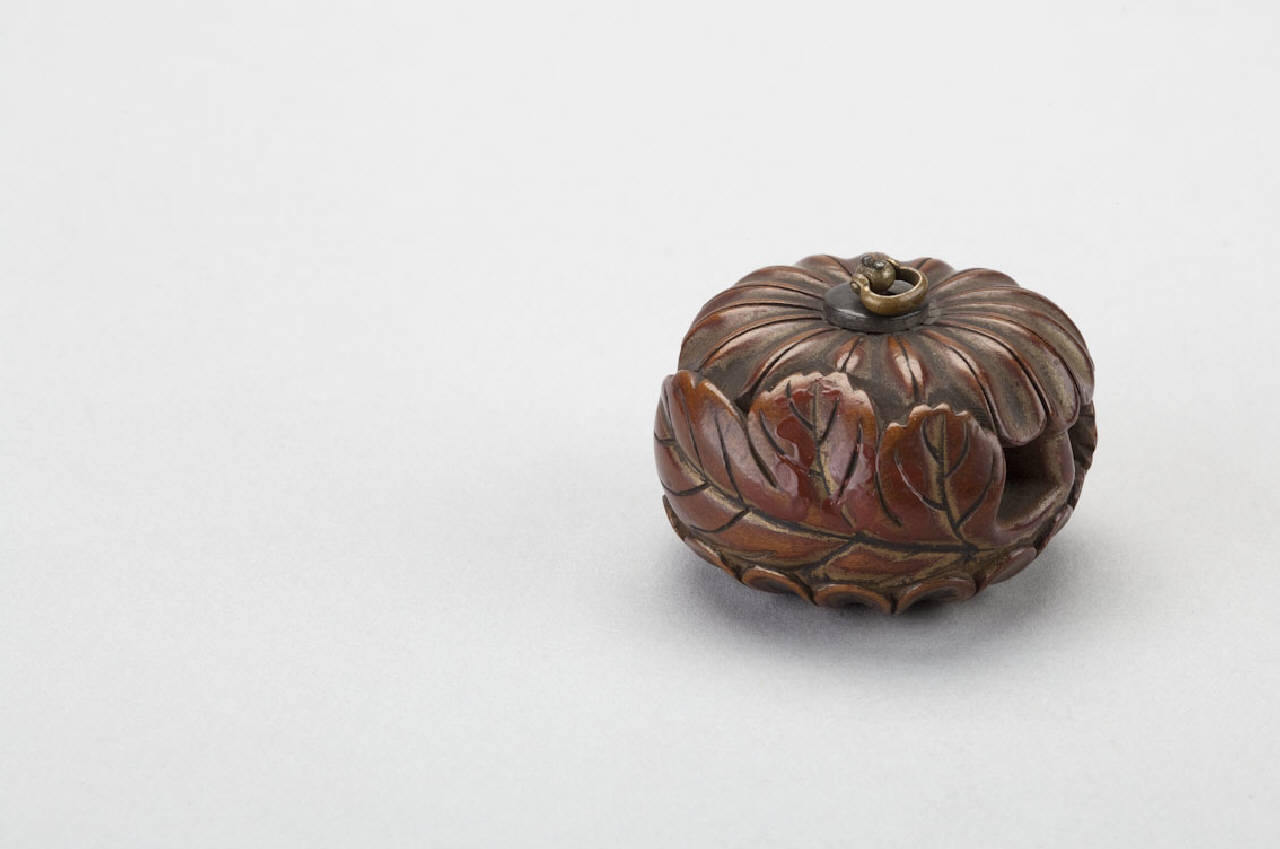 Netsuke in legno intagliato e parzialmente dorato raffigurante un crisantemo stilizzato. Gancio in metallo.