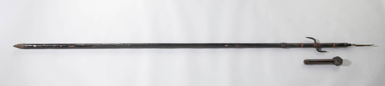 Lancia (yari) triangolare (sankakuyari) scanalato al centro del lato più ampio. Asta nera con avvolgimenti rossi e fornimento in ferro a spuntoni contrapposti. Il fodero associato è nero, cilindrico, con un prisma all'estremità.