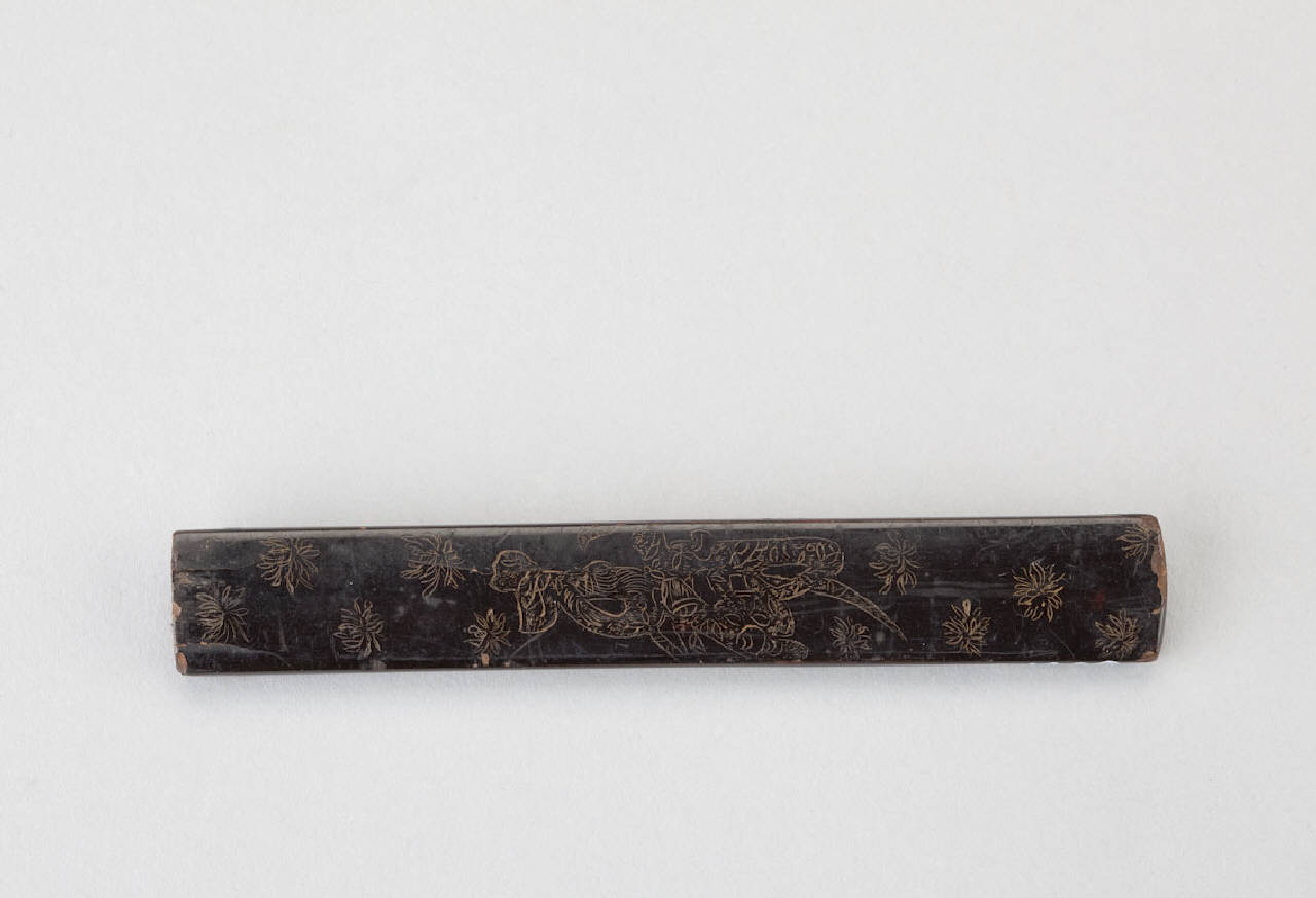 Impugnatura (kozuka) di coltellino (kogatana) in metallo laccato di nero lavorato a incisione e doratura con motivi floreale e carattere beneaugurale.