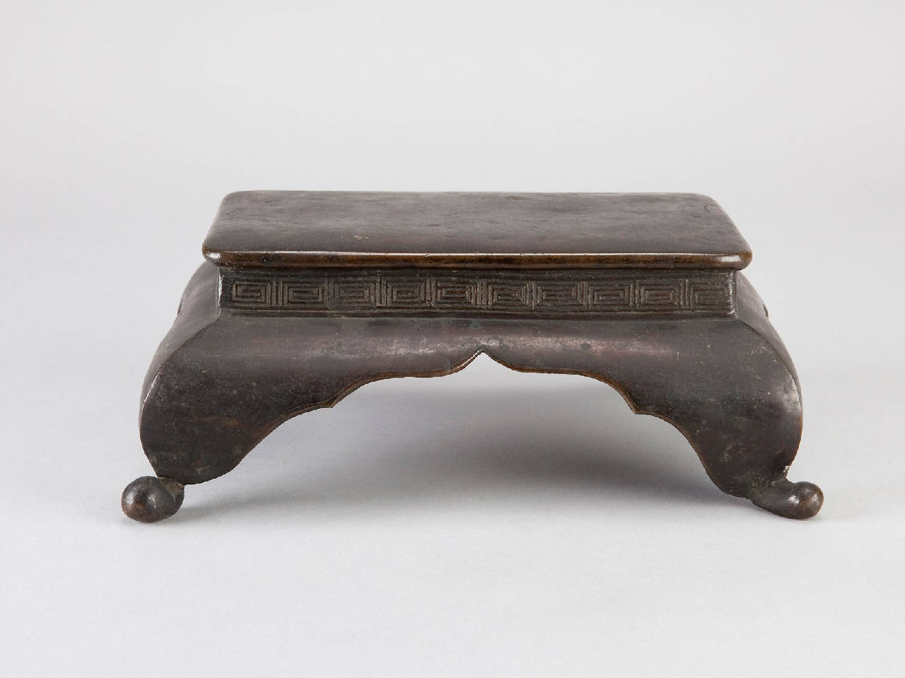 Piedistallo in bronzo con quattro piedini modanati e fascia di greche.