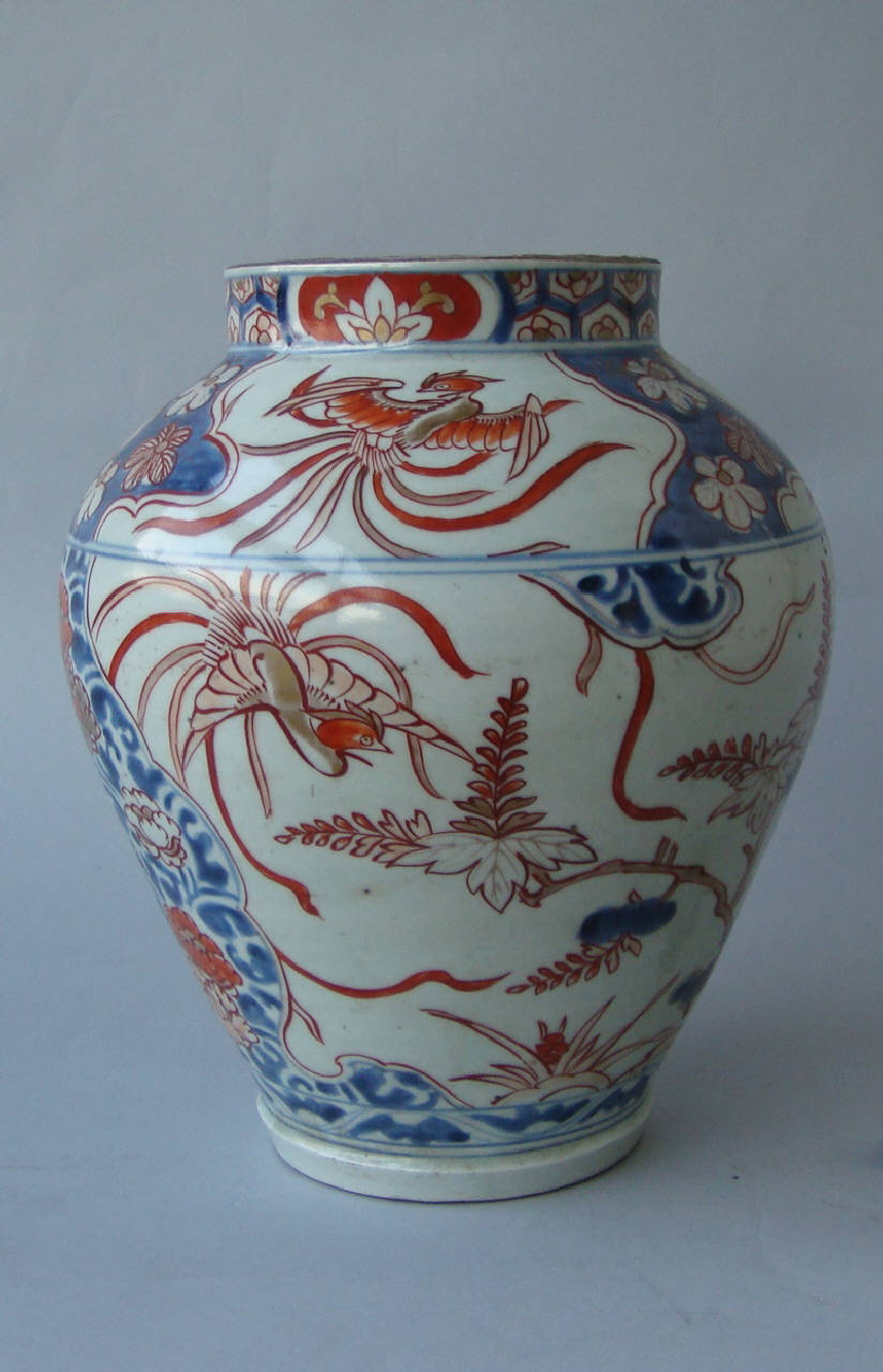 Vaso di porcellana decorato nello stile Imari con smalto blu sotto coperta e smalto rosso e oro sopra coperta a disegni di fenici e racemi di paulonia. Il corpo è a sezione circolare e dall'alta spalla si rastrema verso il piede ad anello.