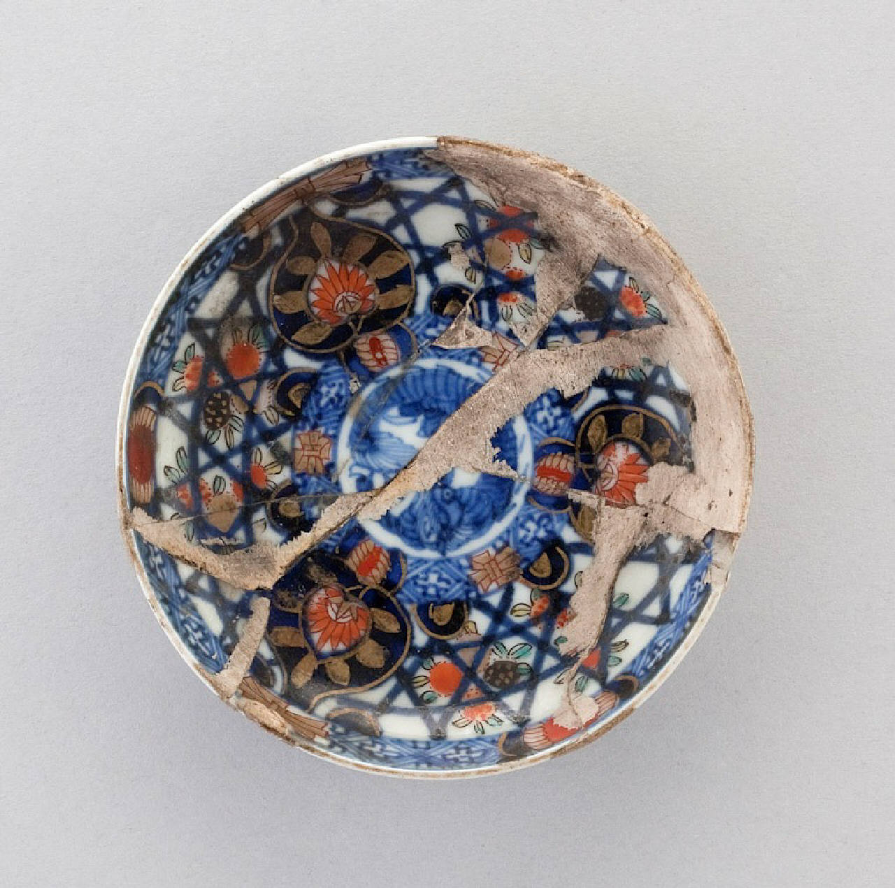 Piattino circolare a parete curva decorato a motivi fitomorfi e geometrici ins tile Imari, con smalti blu sottocoperta e rosso e oro sopracoperta.