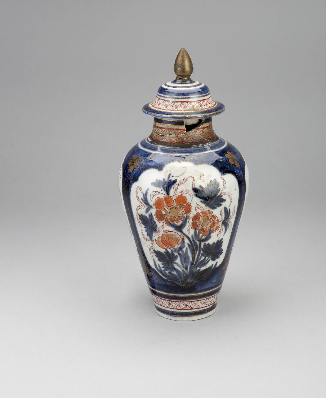 Vaso di porcellana con coperchio a spalla alta e corpo circolare rastremato al piede e collo leggermente rastremato. Su fondo blu sottocoperta, tre riserve polilobate con tre varietà di fiori in rosso e oro. Coperchio a campana con pomolo a bulbo. Tipo Imari.