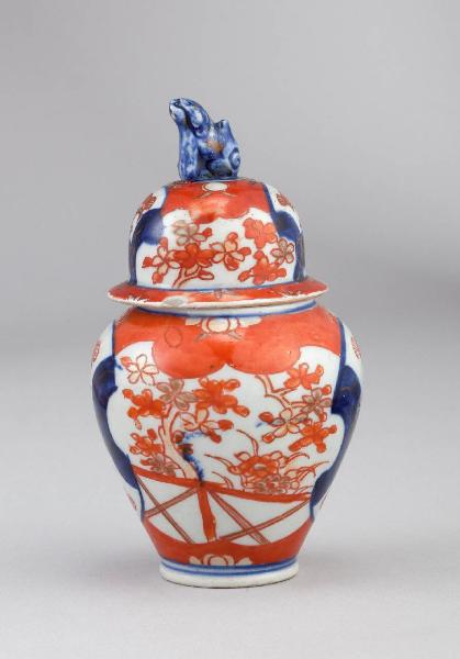 Vasetto a balaustra dal ventre espanso, con coperchio a campana sormontato da pomolo a forma di cane cinese. Imari con fondo rosso e oro sopra coperta, e riserve a ventaglio in blu sotto coperta.