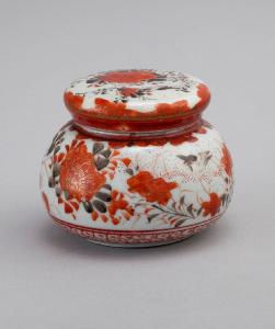Vasetto dal ventre schiacciato, con coperchio circolare piatto. Decorato in rosso e nero a fiori.