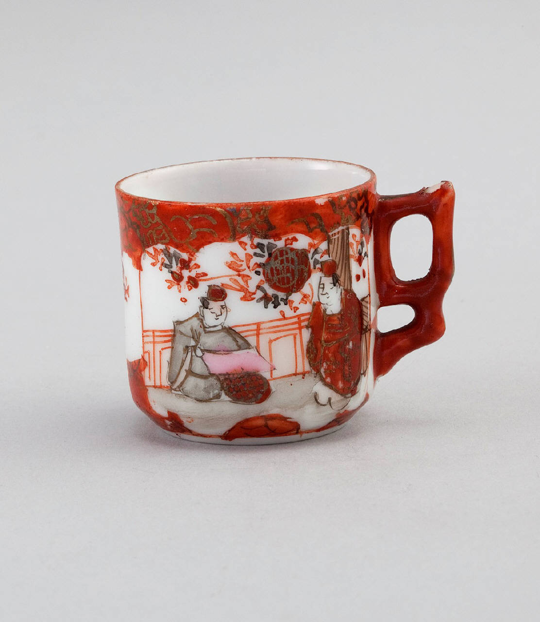Piccola tazzina ansata, decorata a smalti rosso, nero e rosa sopra coperta, con paesaggio con figure maschili, fiori e due uccellini.
