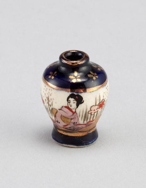 Piccolissimo vasetto con le estremità blu e decorazione centrale di due donne in un giardino.