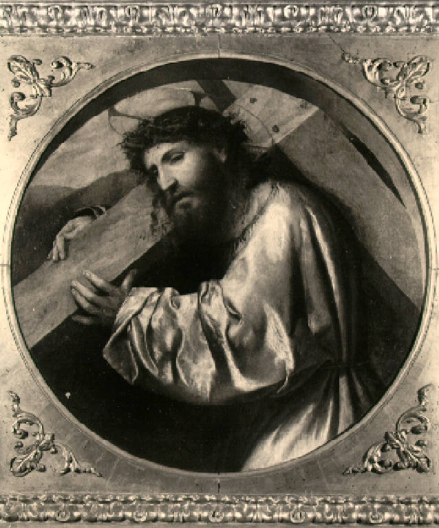 Gesù Cristo, a mezza figura e leggermente di tre quarti verso sinistra, con barba, corona di spine ed aureola crociata, sostiene sulla spalla destra la pesante croce di legno. Sullo sfondo paesaggio. La scena è vista attraverso un finto oculo di marmo scorciato.