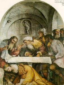 Seduti ad un tavolo Gesù Cristo, il fariseo ed un terzo commensale (moro ?) rivolgono lo sguardo verso Maria Maddalena inginocchiata in primo piano ai piedi di Gesù Cristo. Dietro di loro sono in piedi un servo e due apostoli. La scena è inserita in un ambiente con volta a crociera; sulla parete di fondo, al centro, nicchia con statua e, in alto a sinistra, nido con rondine.