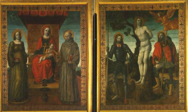 Recto: al centro la Madonna, frontale, seduta su trono a baldacchino, regge con la mano sinistra sulle sue ginocchia Gesù Bambino, tenendo il braccio destro verso l'esterno; a sinistra, in piedi sulla ruota del martirio, volta a destra, Santa Caterina d'Alessandria con il libro e la palma del martirio; a destra in piedi, volto a sinistra, San Bernardino da Siena con il libro e il monogramma di Cristo. Tra le due figure, ai piedi della Madonna, un vaso con pianta di bosso; sullo sfondo: paesaggio; la scena è delimitata da una ricca bordura. Verso: al centro, in piedi su un ceppo e legato a un albero, San Sebastiano, il corpo trafitto dai dardi; a sinistra, in piedi, quasi frontale, San Giorgio, tiene nelle mani una lancia e una spada, poggia il piede sul drago morto; a destra, volto a sinistra, San Rocco con il bordone indica la ferita sulla sua gamba, ai suoi piedi il cane con un pane in bocca; un angelo vola recando la palma del martirio a San Sebastiano. Sullo sfondo: paesaggio.