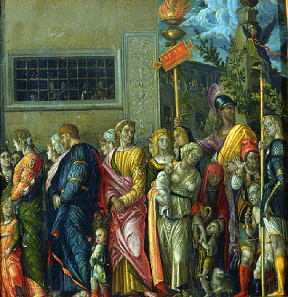 In primo piano corteo di prigionieri, verso sinistra, accompagnato a destra da due guerrieri che reggono insegne militari. In secondo piano a sinistra, edificio con finestra chiusa da una grata e rilievo angolare classicheggiante. A destra, in secondo piano, monumento a cuspide piramidale e sullo sfondo architettura con loggiati, animati da molte figurine.