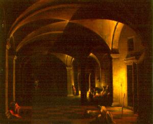 L'ambiente in cui l'evento si consuma è basso e sostenuto da volte a crociera costolonate evidenziate dai tagli di luce; a destra, una porta aperta è rischiarata da una torcia, mentre, poco oltre, alcuni soldati dormono accanto al camino; sullo sfondo, appena visibile, la scena della liberazione dal carcere del santo.
