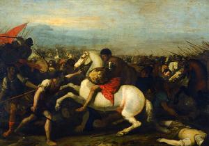 Al centro, un guerriero sopra un cavallo si difende da un giovane appiedato che lo minaccia con una spada e tiene la briglia del cavallo; a sinistra un giovane con lancia esce dalla mischia, mentre a destra incalza un gruppo di cavalieri; a destra in primo piano, un caduto.