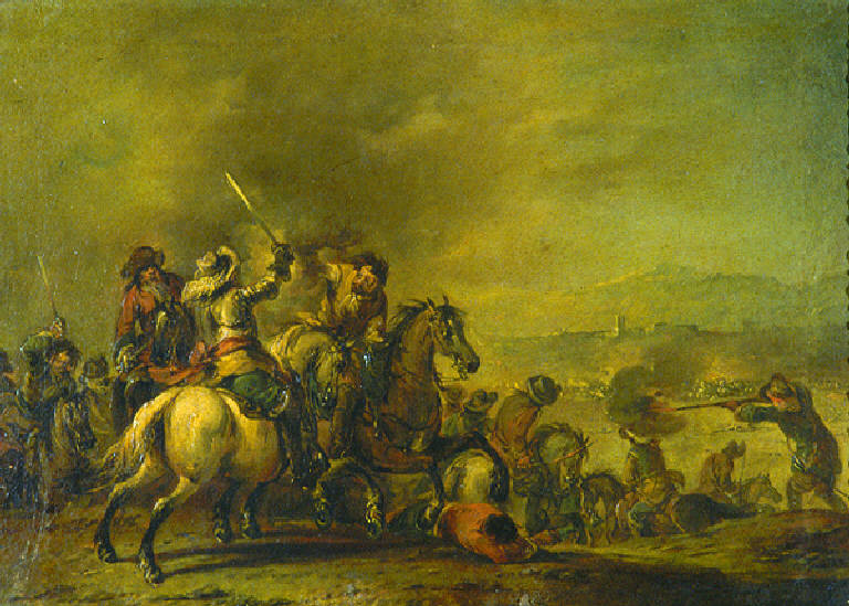 A sinistra due soldati a cavallo si affrontano uno con la pistola, l'altro con la spada; a destra soldati a piedi e a cavallo sono visti di schiena; sul fondo si scorge un paese fortificato sopra una collina.